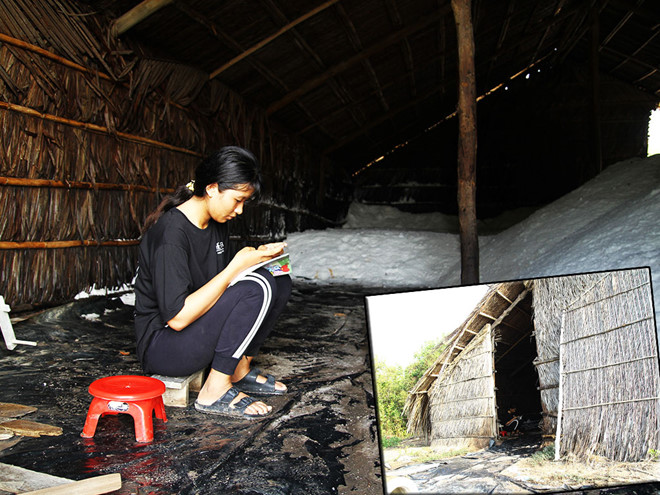 Bất kể ngày hay đêm, cứ cần mạng để học trực tuyến là chị em Nghi lại xách ghế chạy ra chòi muối. Tận dụng khoảng diện tích còn trống trong chòi muối, Nghi đặt một chiếc ghế nhỏ, ngồi xổm và bắt mạng học.