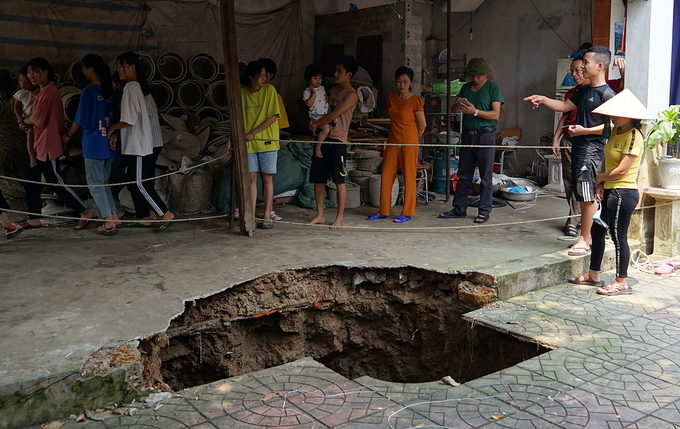 Khoảng 16h40, sáu phụ nữ đang làm hàng mây tre đan ở nhà kho thuộc thôn Nam Hài, xã Nam Phương Tiến, thì cột trụ nhà sụp xuống hố sâu, tạo tiếng động lớn. Mép hố sát vị trí một người ngồi, nhưng may mắn không ai lọt xuống.