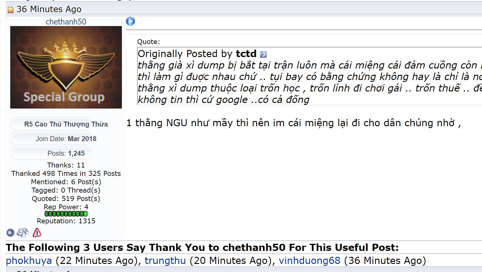 Ừ thì cứ cho nó là Việt cộng đi , nhưng Việt cộng nó chửi đám Việt công giả dạng nằm vùng thì phải ủng hộ chứ , truy lùng đám nón cối ở trong này cũ không khó lắm, vì nền văn hoá Nhân Bản và Khai Phóng của VNCH ít khi thấy cái từ ngữ chửi thề Địt Đéo Đum Điếc bợ...những thành phần nào hay dùng những từ này , 90% là lũ nón cối và Taù hô giả dạng.