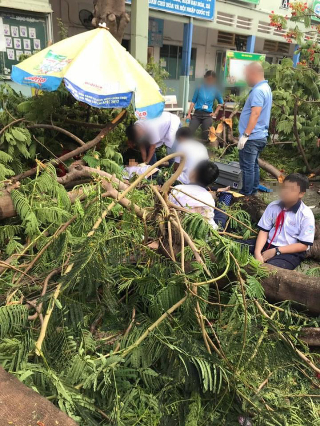 "Có tổng cộng 13 học sinh bị thương. Ngay sau khi xảy ra sự việc, giáo viên, nhân viên trường và phụ huynh đã cùng nhau bế các em ra khỏi đống cây, đưa đến bệnh viện Nhi đồng 2 để chăm sóc. Hiện tại chưa nắm rõ tình trạng sức khỏe từng em", ông Phúc cho biết.