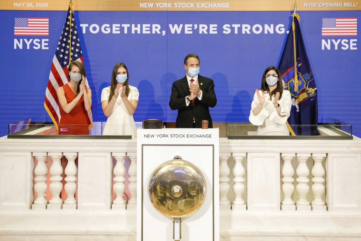 Trước khi mở cửa, các nhà giao dịch xếp hàng bên ngoài tòa NYSE ở Manhattan, đứng trên các mốc màu xanh trên vỉa hè để đảm bảo họ duy trì khoảng cách sáu feet với nhau, trước khi kiểm tra thân nhiệt. Thống đốc New York đeo khẩu trang Andrew Cuomo đánh kẻng mở cửa.