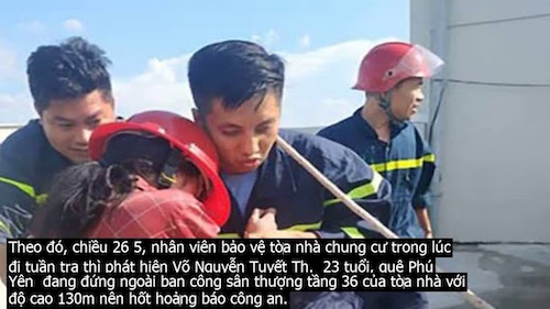 Theo đó, chiều 26-5, nhân viên bảo vệ tòa nhà chung cư trong lúc đi tuần tra thì phát hiện Võ Nguyễn Tuyết Th. (23 tuổi, quê Phú Yên) đang đứng ngoài ban công sân thượng tầng 36 của tòa nhà với độ cao 130m nên hốt hoảng báo công an.