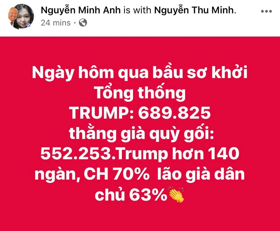 cuồng chồng trump buồn lắm. cuồng chồng trump vietbf chắc cũng buồn theo. 70% phiếu bẩu cho Trump