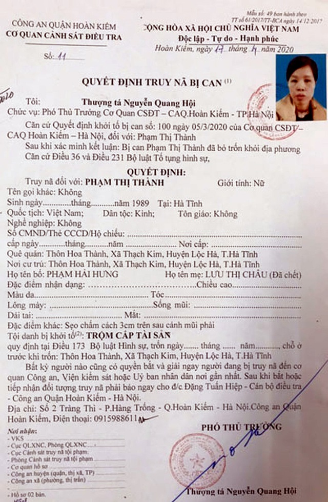 Phạm Thị Thành bị Cơ quan CSĐT - Công an quận Hoàn Kiếm truy nã về tội "Trộm cắp tài sản".