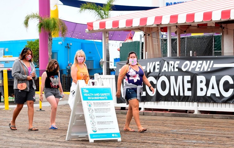 Người dân đeo khẩu trang đi ngang qua bảng hướng dẫn về sức khỏe và an toàn và một nhà hàng mở trên bến tàu Santa Monica tại thành phố Santa Monica, bang California ngày 26/6/2020. (Ảnh qua AFP)