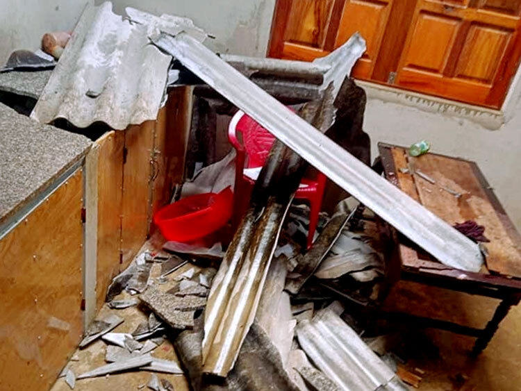 Tấm lợp xi măng đổ xuống nhà dân ở xã Hương Vĩnh. Ảnh: Gia Hân