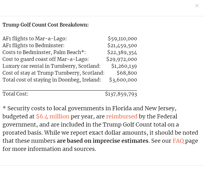 *Daytime visits to golf clubs since inauguration, with evidence of playing golf on at least 128 visits. Our last recorded outing was on July 26, 2020. Click on complete data table for a list of Trump's outings, or view our breakdown of total costs.