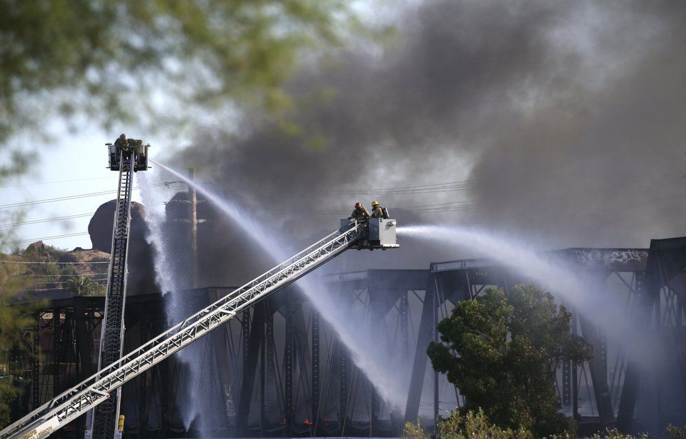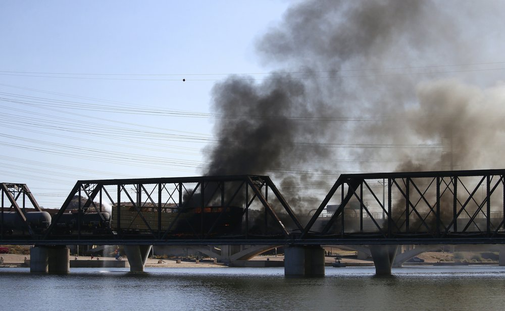 Tàu chở dầu 102 toa bốc cháy, làm sập cầu ở Arizona. Hôm 29/7, một tàu chở hàng bị trật bánh khi băng qua cây cầu bắc ngang hồ nước ở ngoại ô Phoenix, bang Arizona, Mỹ. Nó khiến cây cầu bốc cháy và bị sập một phần.