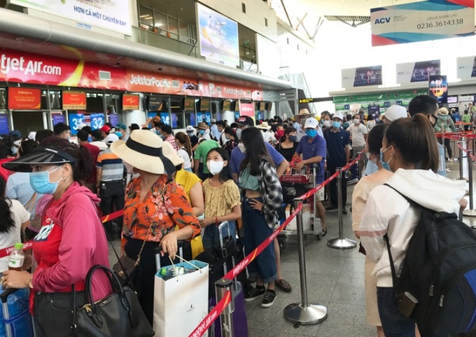Hành khách xếp hàng tại sân bay Đà Nẵng ngày 26/7. Ảnh: Anh Duy.