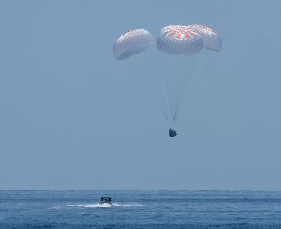 Rạng sáng ngày 3/8 (giờ Việt Nam), tàu vũ trụ Crew Dragon đã quay trở lại Trái Đất và hạ cánh xuống vùng biển vịnh Mexico, ngoài khơi Florida, Mỹ. Đây là nhiệm vụ thành công đầu tiên của một con tàu vũ trụ do SpaceX sản xuất. (Ảnh: NASA)