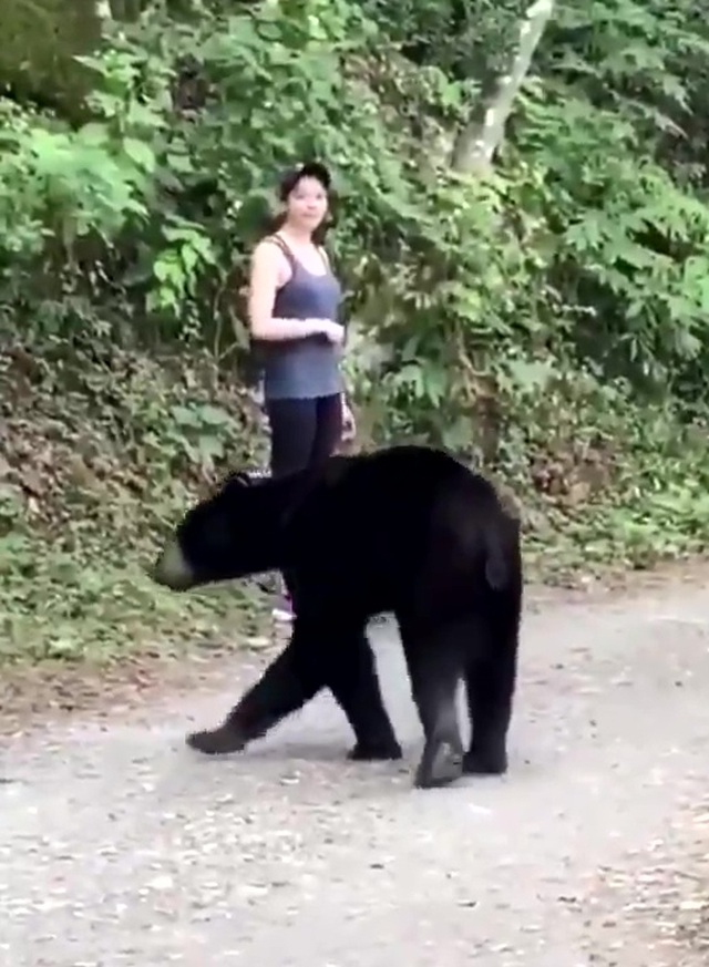 Con gấu thậm chí đứng bằng hai chân như người, ngửi tóc một cô gái trẻ trong nhóm. Thấy vậy, người này vẫn bình tĩnh đứng yên, trong khi người còn lại trong nhóm cố gắng đánh lạc hướng con vật.