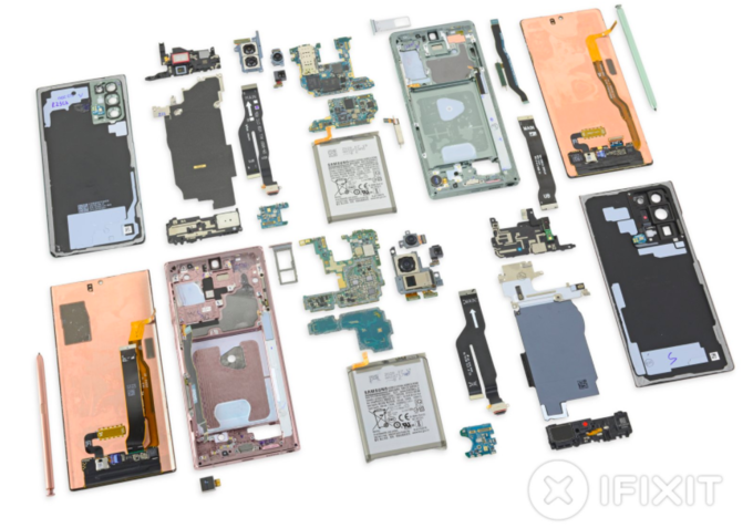 Toàn bộ linh kiện Galaxy Note20 và Note20 Ultra. Ảnh: iFixit.