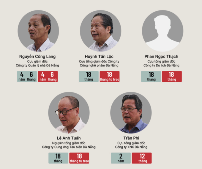 Theo đó, Nguyễn Công Lang lãnh 4 năm 6 tháng tù; Huỳnh Tấn Lộc 18 tháng tù treo; Phan Ngọc Thạch 18 tháng tù; Trần Phi 12 tháng tù; Lê Anh Tuấn 18 tháng tù treo.