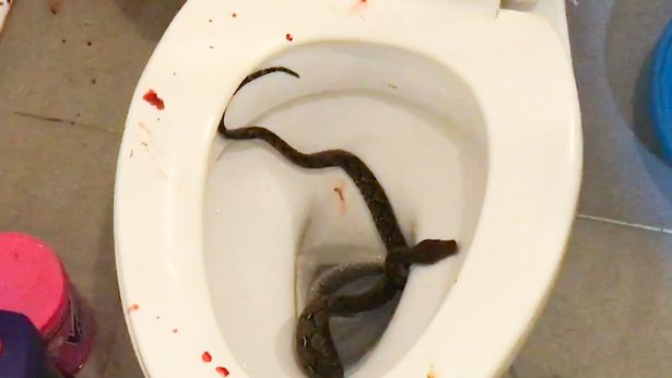 Chàng trai cúi đầu xuống và nhìn thấy một con trăn đang ngoạm lấy của quý của mình. Cú cắn mạnh của trăn khiến máu chảy ra khắp bồn cầu.