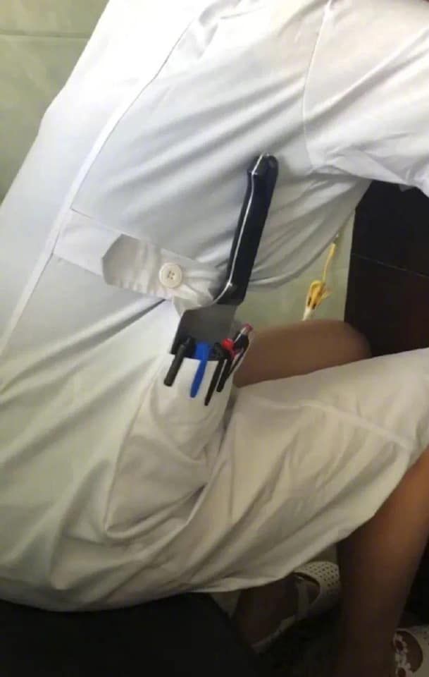 Trong bức ảnh gây bão mạng, vị bác sĩ để thủ sẵn một con dao làm bếp khá to trong túi áo cùng với nhiều cây bút viết. Điều này khiến bất cứ ai có ý định gây sự với bác sĩ cũng phải kiềm chế lại ngay.