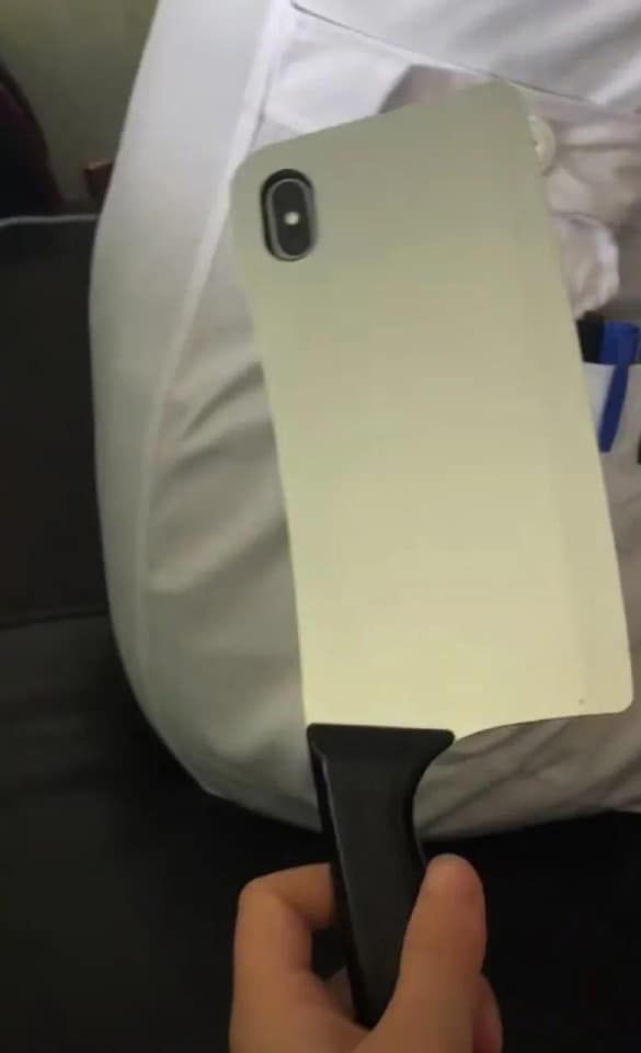 Thế nhưng khi rút con dao ra xem thử thì ai nấy đều vô cùng ngỡ ngàng. Hóa ra bên trong con dao có vẻ "hổ báo" kia lại là chiếc điện thoại iPhone X.