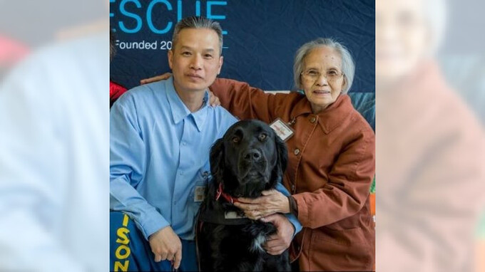 Ông Tin Nguyen và mẹ, bà Thi Cuc Le, 84 tuổi, ở hạt San Bernardino, tại lễ tốt nghiệp chương trình dạy tù nhân huấn luyện chó trị liệu vào năm 2018. Ảnh: VietRise.
