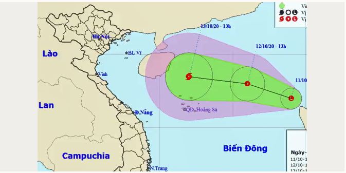 Đến 13h ngày 12/10, tâm áp thấp nhiệt đới ở cách quần đảo Hoàng Sa khoảng 450 km, sức gió mạnh nhất 65 km/h, cấp 7, giật tăng hai cấp.