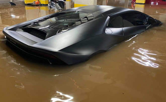Hậu quả là hàng trăm ô tô đỗ ở đây bị nước lũ nhấn chìm, đáng chú ý trong số xe này có các mẫu xe đắt tiền của Range Rover, Porsche Panamera hay một chiếc siêu xe Lamborghini Huracan LP610-4 màu đen nhám - chiếc đang "nổi như cồn" trên mạng xã hội.