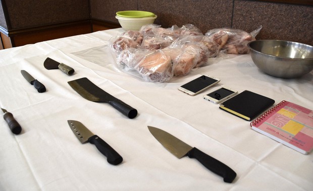 Những miếng thịt lợn và dao làm bếp được tìm thấy trong căn hộ của 4 người đàn ông Việt Nam ở Ota, tỉnh Gunma, hôm 28/10. Ảnh: Mainichi.