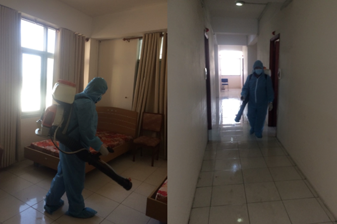 Trung tâm y tế quận Tân Bình tổ chức phun khử khuẩn tại 2 địa điểm cách ly của Vietnam Airlines. (Ảnh:HCDC).