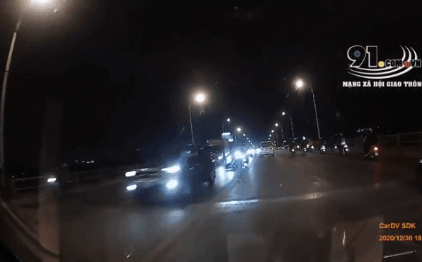 Vụ tai nạn xảy ra vào khoảng 18h35 ngày 30/12 trên cầu Vĩnh Tuy, Hà Nội. Hai chiếc xe máy xảy ra va chạm. Một người đàn ông loạng choạng, lao sang làn đường ngược chiều, kéo theo xe máy còn lại. Xe của ông này đâm sầm vào một ô tô lưu thông hướng ngược chiều. Nạn nhân bị thương nặng.