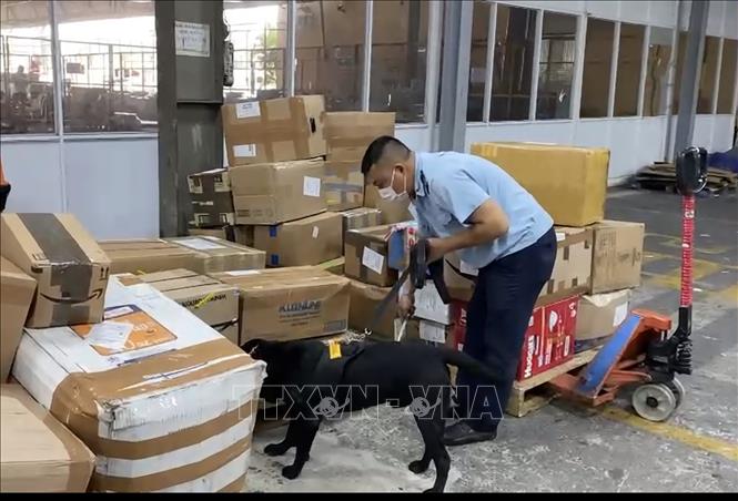 Lực lượng hải quan sử dụng chó nghiệp vụ để kiểm tra các lô hàng cất giấu cần sa. Ảnh: TTXVN phát