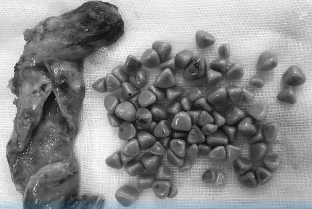 Sau khi vào ổ bụng ê kíp bác sĩ phát hiện bên trong túi mật có rất nhiều viên sỏi cứng, hình tháp, kích thước đồng đều, giống những chiếc răng người được lấy ra ngoài. Một tuần sau can thiệp lấy sỏi, bệnh nhân đáp ứng tốt, tình trạng nhiễm trùng và đau bụng giảm dần, các bác sĩ tiếp tục tiến hành can thiệp phẫu thuật nội soi cắt bỏ túi mật, điều trị dứt điểm cho bệnh nhân.