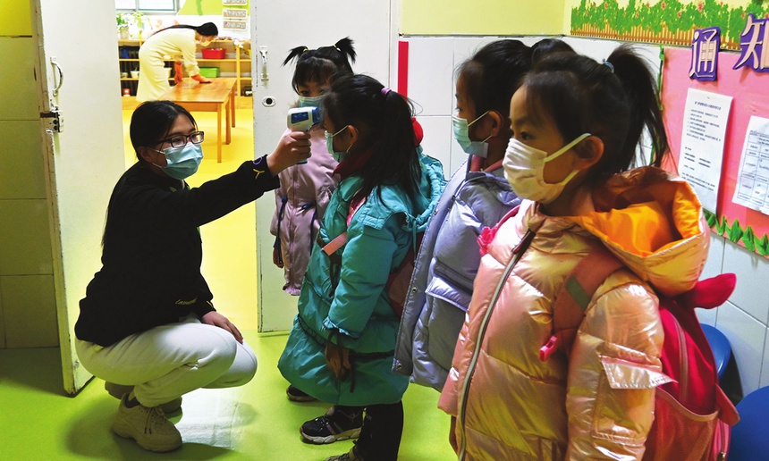 Giáo viên đo nhiệt độ cho các em học sinh ở một trường mẫu giáo tại Thạch Gia Trang, tỉnh Hà Bắc hôm 5/1. Ảnh: CNS.