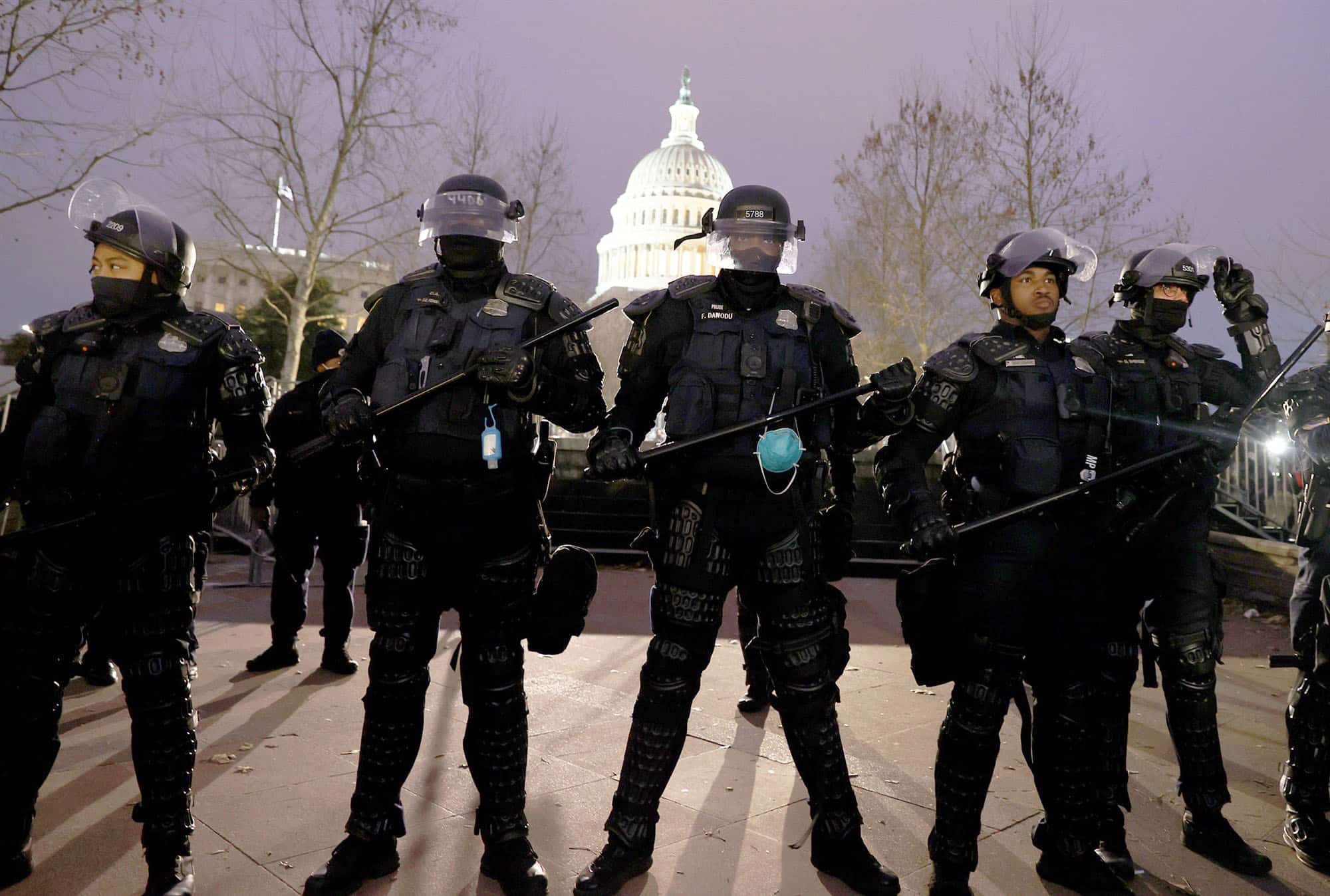 Cảnh sát Mỹ đứng gác trước tòa nhà quốc hội hôm 6/1. Ảnh: Getty