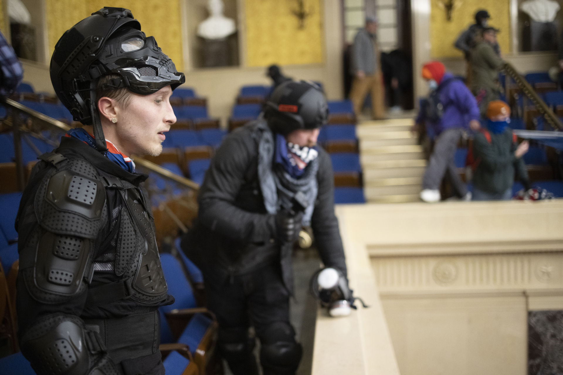 Những người nổi loạn ủng hộ Tổng Thống Trump trong trang phục “tác chiến” tràn vào bên trong điện Capitol. (Hình: Win McNamee/Getty Images)