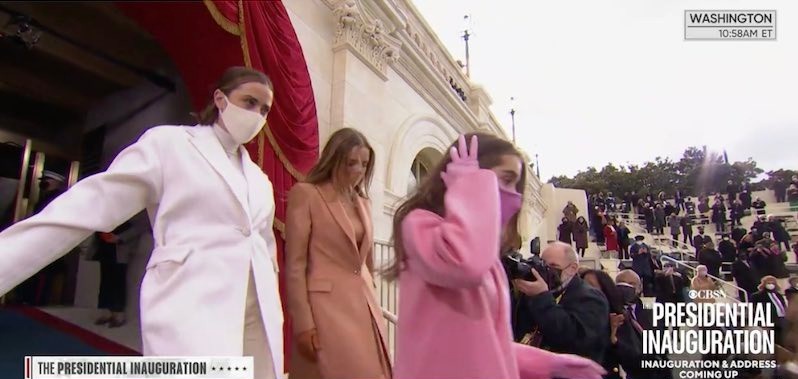 Naomi (28 tuổi), cháu gái đầu lòng của tổng thống Mỹ, chọn một bộ váy thanh lịch màu trắng, biểu tượng của phong trào chính trị Suffragette. Em gái của cô, Finnegan (21 tuổi), mặc chiếc áo khoác dạ dài màu camel thanh lịch. Ảnh: CNBC.