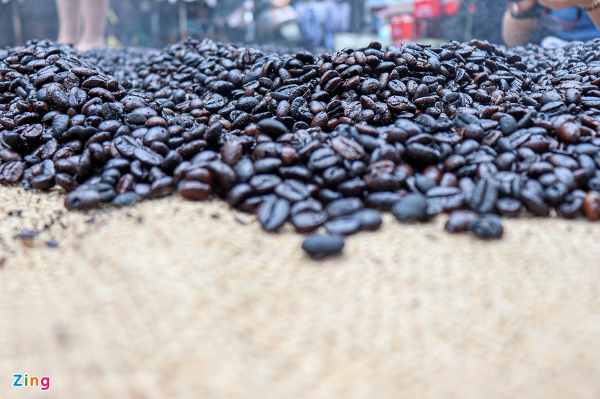 Muối được cho vào sau mỗi 15 phút quay chảo rang để giảm độ chát, còn bơ thì cho vào sau. Cà phê kho xong được trải ra tấm vải, tưới thêm rượu để có hương vị đặc trưng. Toàn bộ quá trình kho diễn ra gần 4 tiếng đồng hồ.
