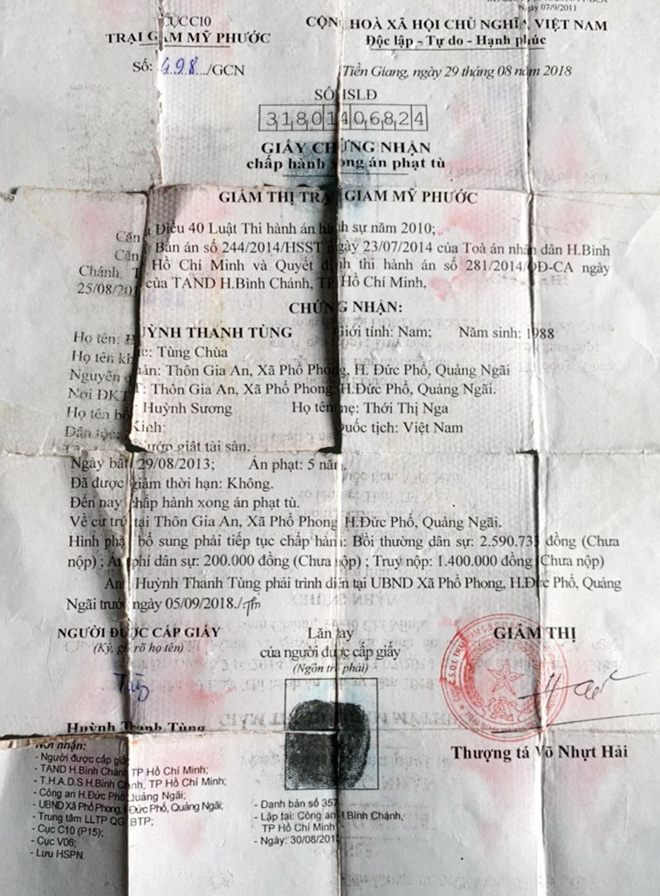 Được biết vào cuối tháng 8/2013, Huỳnh Thanh Tùng từng gây án “Cướp giật tài sản” và đã bị TAND huyện Bình Chánh, TP Hồ Chí Minh xử phạt 5 năm tù tại bản án số 244/2014/HSST ngày 23/7/2014, đến ngày 19/8/2018 mới rời Trại giam Mỹ Phước – Bộ Công an ở tỉnh Tiền Giang sau khi chấp hành xong hình phạt tù.