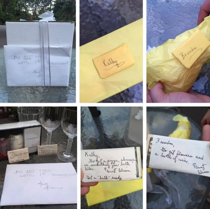 Một món quà bí mật suốt nhiều năm không được mở, mặc dù Kathy và Brandon đã nhiều lần bất đồng, tranh cãi, chiến tranh lạnh. Chia sẻ trên Facebook, Kathy viết: "Tôi nghĩ lại ngày cưới của chúng tôi và cố nhớ lại những món quà cưới có ý nghĩa khi đó. Điều buồn cười là món quà ý nghĩa nhất vẫn nằm trong tủ chưa mở ra". Được dì hứa hẹn món quà trong hộp sẽ giúp hôn nhân hạnh phúc, cặp vợ chồng người Mỹ chờ 13 năm mới dám mở chúng.