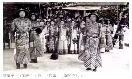 Nhất cử nhất động của Từ Hi thái hậu đều được người đời quan tâm, trong dân gian lưu truyền rằng bà có “4 điều kỳ quặc” khiến cho các thái giám và cung nữ đều vô cùng khổ sở. Điều kỳ quặc thứ nhất của Từ Hi là “không che ô khi trời mưa”. Đối với người bình thường mà nói thì chuyện này vốn chẳng có gì lạ, ngày thường thường xuyên đi ra ngoài dạo chơi vừa có thể giải tỏa tâm trạng vừa có thể tăng thêm sự lãng mạn trong cuộc sống. Nhưng nếu điều này xuất hiện trên người của Từ Hi thì lại khác.