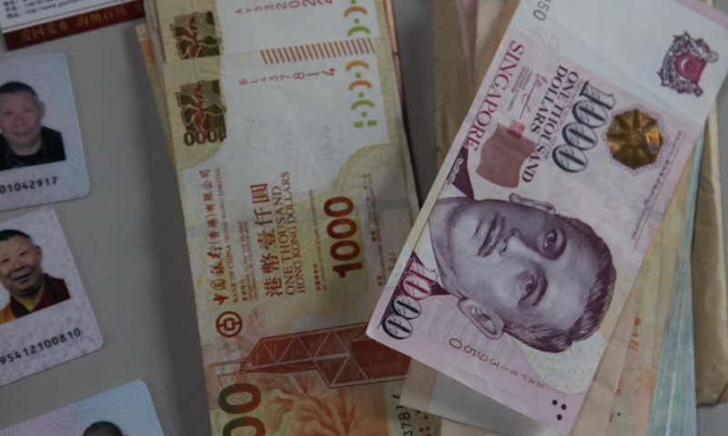 Số tiền và giấy tờ giả mạo được tìm thấy tại nhà của Wang. Ảnh: Hoàn cầu