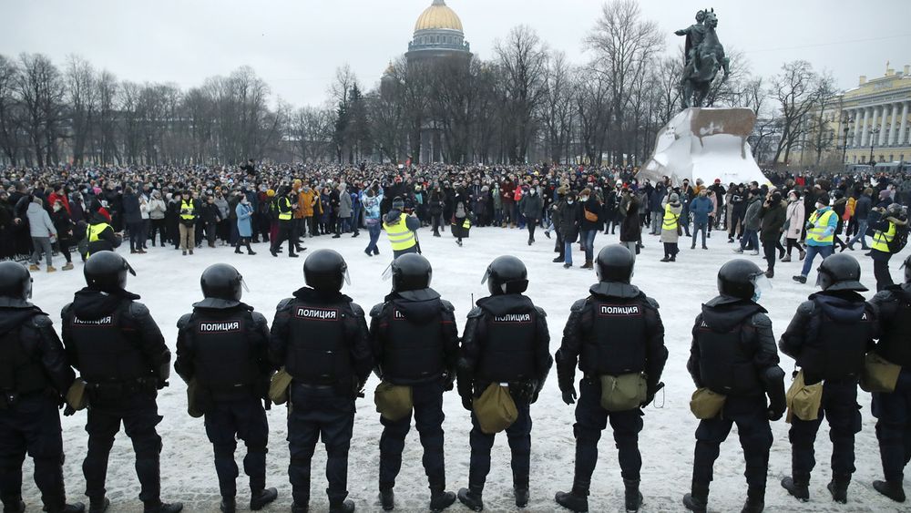 Cảnh sát đứng gác trong cuộc biểu tình phản đối việc bỏ tù nhà lãnh đạo đối lập Alexei Navalny ở St.Petersburg, Nga, Thứ Bảy, ngày 23 tháng 1 năm 2021 (AP)