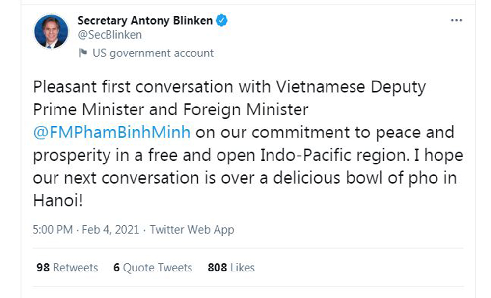 Vào hôm Thứ Năm, 4 Tháng Hai, thông cáo của Bộ Ngoại Giao Hoa Kỳ cho biết, là ông Antony Blinken, tân ngoại trưởng Mỹ, vừa điện đàm với ông Phạm Bình Minh, phó thủ tướng kiêm ngoại trưởng Việt Nam, và hẹn cùng ăn phở với ông Minh ở Hà Nội.