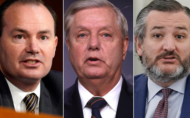 Nhóm thượng nghị sĩ đảng Cộng hòa gồm Ted Cruz, Mike Lee và Lindsey Graham hôm 11-2 tập trung tại một căn phòng gần Thượng viện, nơi nhóm luật sư của cựu Tổng thống Trump đang sử dụng để làm việc trong thời gian diễn ra phiên tòa luận tội ông.
