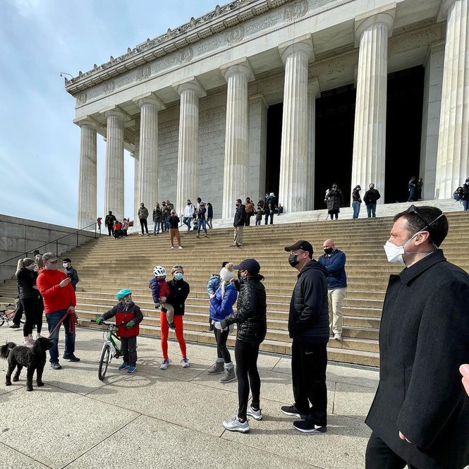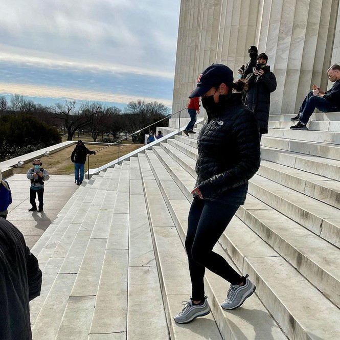Theo BI, Tran và bạn gái phát hiện bà Harris đang chạy lên chạy xuống cầu thang dưới chân Đài tưởng niệm Lincoln cùng phu quân Doug Emhoff và nhân viên mật vụ.