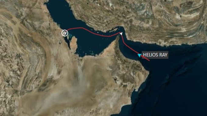 Vị trí tàu Helios Ray ở Vịnh Oman khi bị trúng vụ nổ. Đồ họa: CNBC.