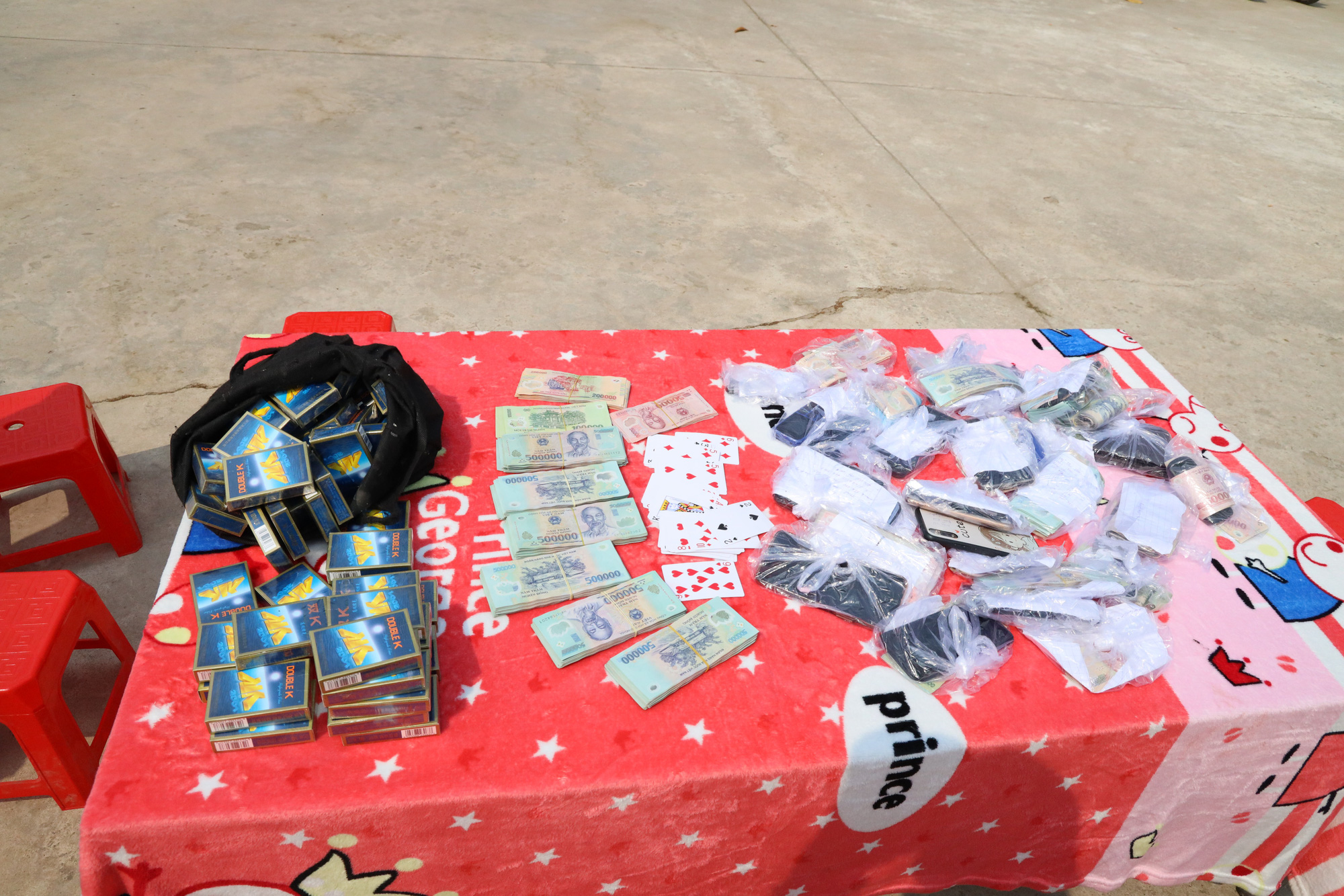 Công an bắt quả tang 33 đối tượng, số đông là phụ nữ đang sát phạt. Tang vật thu giữ gồm gần 550.000.000 đồng, 60 bộ bài tây, 7 xe môtô và một số tang vật khác có liên quan.