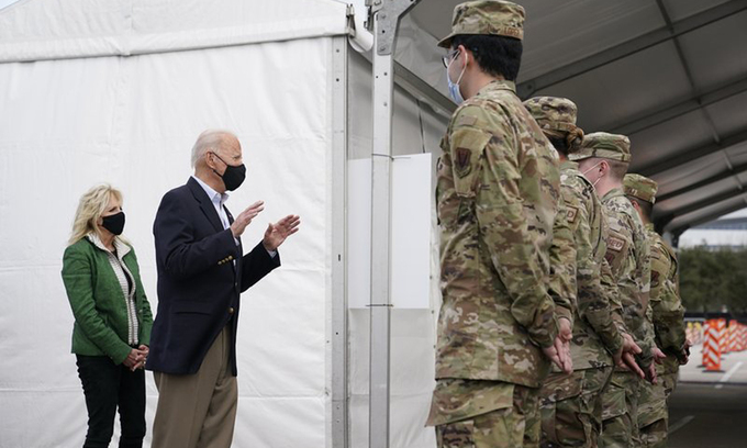 Tổng thống Biden nói chuyện với lính Mỹ tại một trung tâm tiêm chủng ở Houston, Texas hôm 26/2. Ảnh: AP.