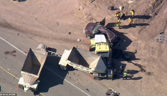 Vụ tai nạn giữa xe đầu kéo và xe SUV xảy ra vào khoảng 6h15 sáng 2/3 theo giờ địa phương trên đường cao tốc ở khu vực Holtville, cách San Diego 160 km về phía đông. (Ảnh: Fox)