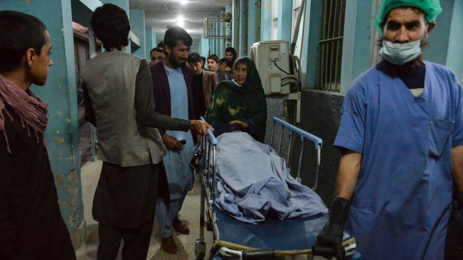 Nhân viên bệnh viện và người thân chuyển thi thể của một trong 3 nữ nhân viên truyền thông bị bắn chết ngày 2/3 trong hai vụ tấn công riêng biệt tại một bệnh viện ở Jalalabad, Afghanistan.