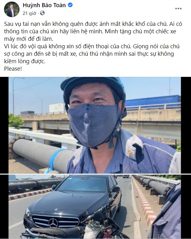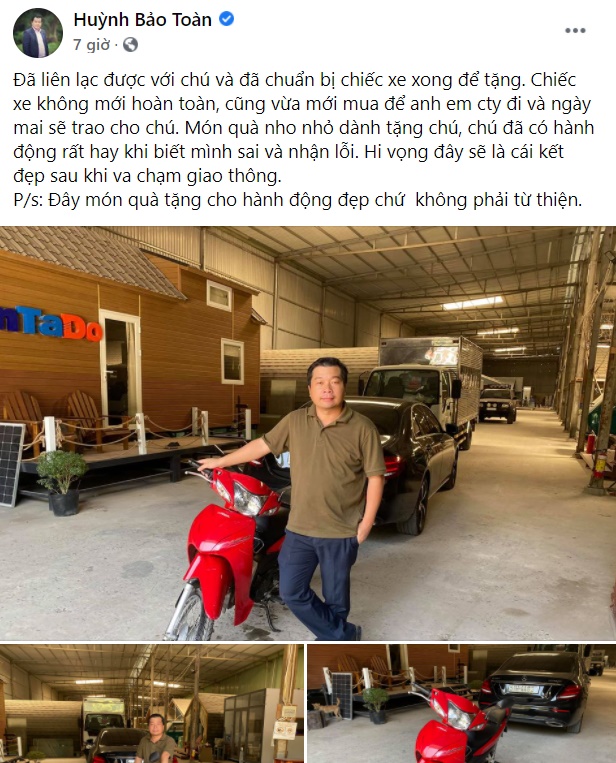 Sau vụ tai nạn, mới đây, trên tài khoản của chủ xe Mercedes - ông Huỳnh Bảo Toàn đã đăng tải dòng trạng thái với nội dung muốn xin thông tin người đàn ông đi xe máy vì muốn "tặng chú một chiếc xe máy mới để đi làm". Chủ tài khoản cho biết, ông không quên được ánh mắt khắc khổ, thật thà của người đàn ông trong vụ tai nạn.