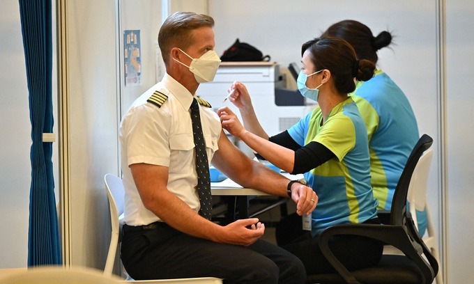 Một phi công tiêm vaccine Sinovac tại trung tâm tiêm chủng Thư viện Trung tâm Hong Kong hôm 23/2. Ảnh: VCG