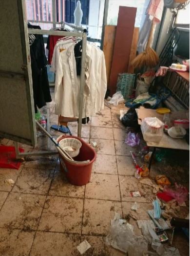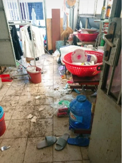 Bát đĩa cũng không được rửa gọn gàng mà quăng đại vào 1 góc. Dù trong nhà đầy đủ dụng cụ chổi quét nhà lẫn lau nhà nhưng dưới đất vẫn vương vãi bùn đất. Hình ảnh này khiến ai nhìn qua cũng rùng mình vì không hiểu chủ nhân căn phòng là ai mà có thể sống trong môi trường lộn xộn như vậy.