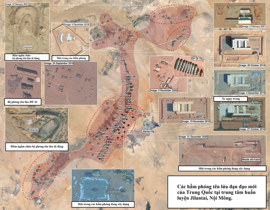Ảnh vệ tinh cho thấy các hầm phóng tên lửa đạn đạo mới của Trung Quốc tại trung tâm huấn luyện Jilantai, Nội Mông. Ảnh: FAS.